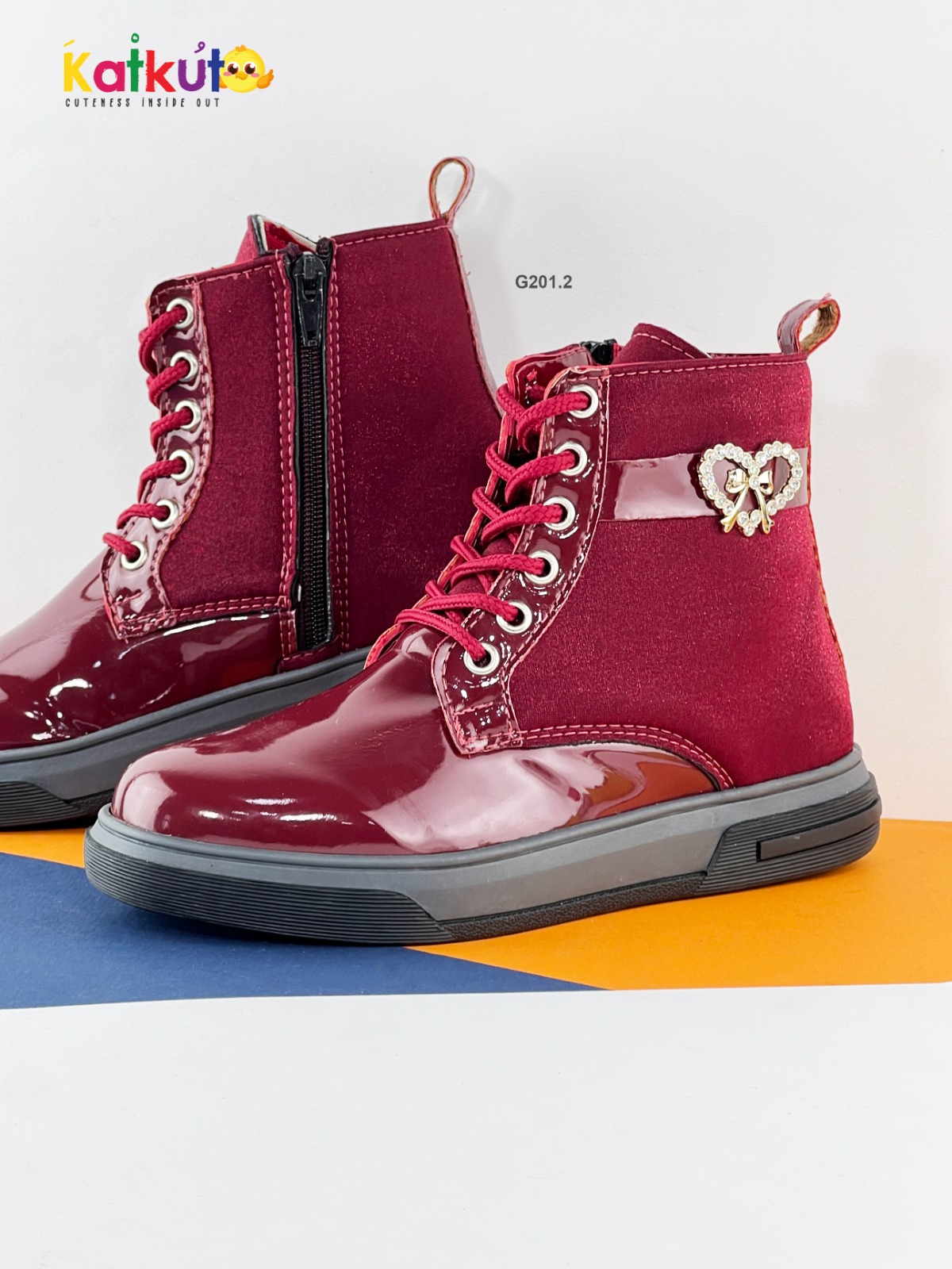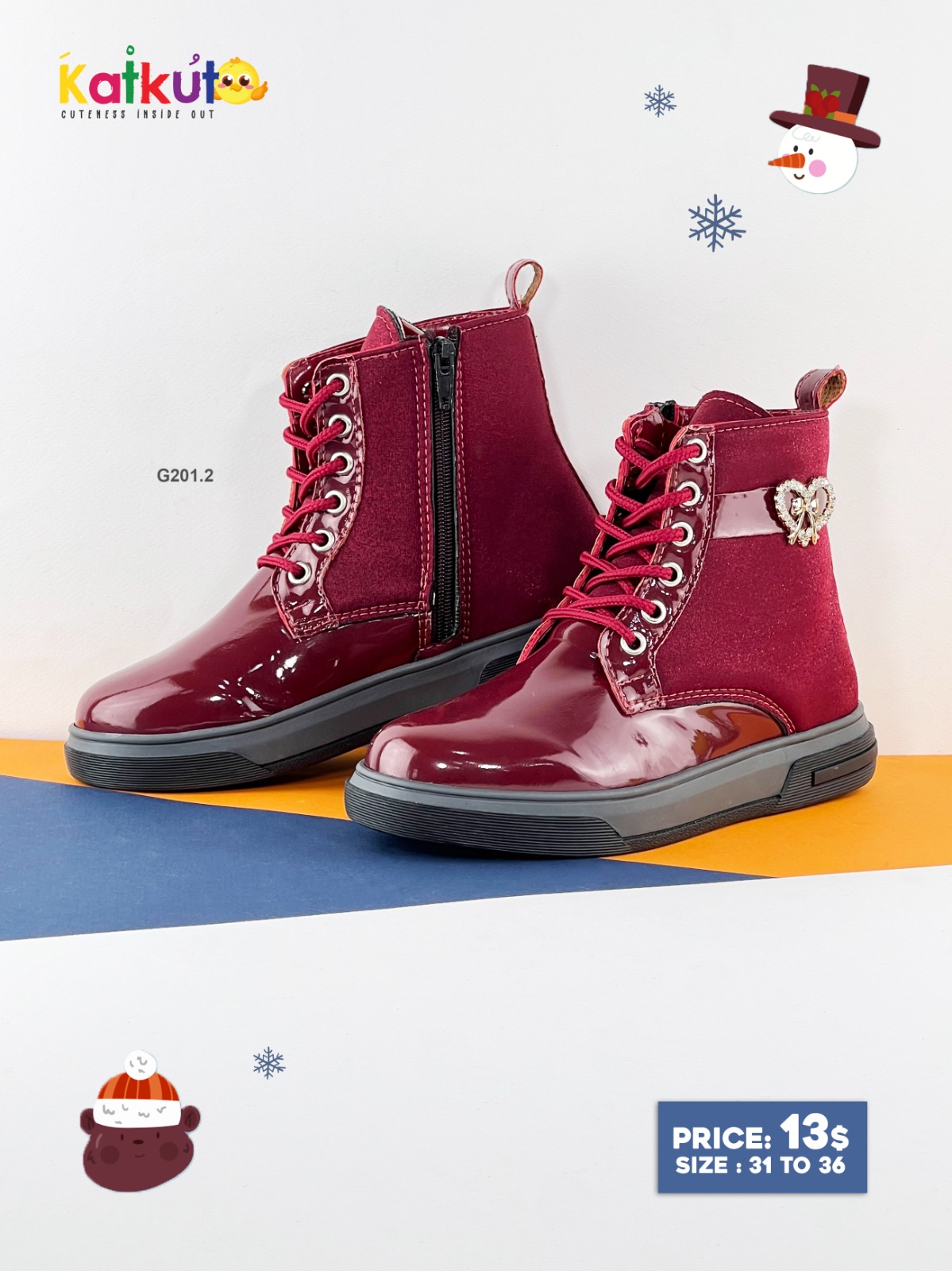 Elegant burgundy winter boots with a sparkling heart buckle and a side zipper for easy wear—stylish, comfortable, and perfect for every little girl